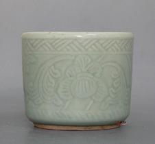 清咸豐 景德鎮(zhèn)窯豆青釉刻牡丹紋筒式爐