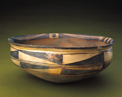 彩陶盆,新石器時代仰韶文化半坡類型,高16.4cm,口徑37.4cm。 盆折沿,深直腹,圜底。泥質(zhì)紅陶。口沿及外腹部均以黑彩描繪紋飾,口沿上描繪以點定位的水波紋,腹部描繪兩層三角形幾何紋,兩層紋飾中三角形的大小及形狀相同,但方向相反。這種三角形紋飾可能是由魚紋逐漸抽象演變而來。此彩陶盆的造型和紋飾具有新石器時代仰韶文化半坡類型的明顯特征。