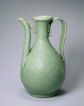 此壺為龍泉窯制品,釉色瑩潤,青翠欲滴,造型為玉壺春瓶形,具有元代瓷器的典型特征。