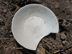 這些陶瓷殘器和碎片,有碗、盤、碟、盞等,精粗不一,釉色和器型各異,精細(xì)的胎質(zhì)細(xì)膩,還有劃花裝飾,有的底下有墨書(shū)的字符,以精細(xì)的占多數(shù)。蔡昌振在仔細(xì)翻檢觀看后認(rèn)為,陶瓷殘器和碎片確實(shí)是宋代的,大多為北宋時(shí)期。且從精細(xì)程度看,這些瓷器并非本地生產(chǎn),而是出自北方及福建等地,在當(dāng)時(shí),普通人家是用不起的,應(yīng)為官宦人家所用。