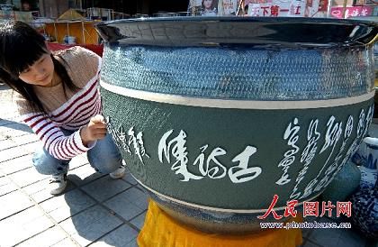 10月8日,一口需要5個大人才能抬動,標(biāo)價36萬元的天下第一缸,在江蘇連云港市新浦隴海步行街對外展示。 據(jù)悉,這口大缸是由江西景德鎮(zhèn)老五瓷廠高級工藝師設(shè)計燒制,高80公分、直徑95公分,采用多種工藝燒制而成,缸體色澤鮮亮,刻有草書詩詞,讓觀者看后嘖嘖稱絕。