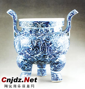 現陳列在南京博物院《明清瓷器陳列》展廳中的青花壽山福海紋爐,胎體厚重,器型高大,外壁繪壽山福海紋,集人文意蘊與高超的制瓷技術于一體,表現出撼人心魄的藝術張力。陳列于展廳的獨立柜中,非常引人注目。這是明宣德官窯器中的黃鐘大呂之作。