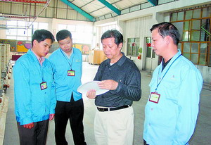 陳顯彬(右二)在生產(chǎn)車間與工人一起研究產(chǎn)品質(zhì)量。