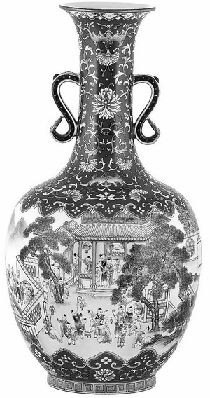 乾隆時(shí)期的粉彩有如下特點(diǎn):1.乾隆粉彩利用粉彩粉潤柔和的質(zhì)感,用粉化的各種彩料仿制各種工藝品,能準(zhǔn)確地表現(xiàn)出所仿之物的色彩和質(zhì)感,可謂惟妙惟肖。2.乾隆粉彩有一個(gè)獨(dú)有的特征,即器物口部及底部都施松石綠釉。松石綠釉非常淺淡光潤,釉面猶如粥皮,由于是一種低溫彩釉,釉面常常帶有細(xì)小的紋片。3.乾隆官窯粉彩的紋飾一般是“大內(nèi)”送來的圖樣,主題紋飾按不同時(shí)節(jié)都有嚴(yán)格規(guī)定,主紋是纏枝花,分別加施變龍、變鳳、蝙蝠或纓絡(luò)、八吉祥等,組成各種祥瑞吉慶、美意延年內(nèi)容的圖案。4.乾隆粉彩的造型工藝更是精益求精,不論是高達(dá)一米多的大型陳設(shè)瓷,還是小至幾厘米的扳指兒、鼻煙壺,造型都非常規(guī)整,很少出現(xiàn)夾扁或歪塌現(xiàn)象。 此件清乾隆粉彩春燈嬰戲雙耳瓶為乾隆粉彩的代表作品,無論從色彩、器形、工藝上都有很大的特點(diǎn),尤其在文化內(nèi)涵上更是反映了封建帝王希望“百子千孫”、“江山永固”的思想。同時(shí)也反映了千百年來勞動人民盼望有子傳宗接代的良好愿望。此瓶細(xì)長頸,撇口,耳作如意形,喻“平安如意”,碩腹,平底,矮圈足,口及耳描金,頸至肩及腹底以如意云頭為邊,在紅地上畫纏枝番蓮間飾蝙蝠。腹部彩繪高山流水,庭舍樓臺,配以樹石花草,眾嬰孩嬉戲其間,或舞龍或提燈,足邊描回紋,器內(nèi)及底均施湖綠色釉,底描紅書“大清乾隆年制”六字篆款。