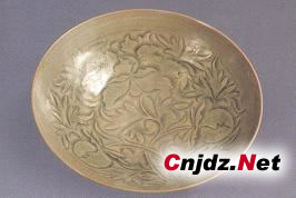 這件北宋刻花牡丹紋碗,高7.5厘米,口徑23.3厘米,底徑6厘米。敞口,弧腹,圈足,足削修規(guī)整,足底露胎,胎呈灰褐色,胎質(zhì)堅(jiān)密。碗內(nèi)刻花,一周弦紋下刻纏枝牡丹花葉紋,一花盛開,二蕾含苞待放,花葉上均劃出葉脈。該碗刀鋒犀利、瀟灑,深淺有致。牡丹花繁而不亂,既追求了形式變化,又能保持整體的和諧統(tǒng)一;ü谪S滿,花葉分披,花枝纏繞,奔放流暢,給人以欣欣向榮之感。通體施以青釉,釉色青中閃黃,花紋清晰,濃淡相間,紋樣微凸,具有很好的視覺效果。牡丹花在中國傳統(tǒng)文化中寓意著富貴,器物上飾纏枝牡丹是耀州窯北宋中期最為盛行的題材,該碗當(dāng)為耀州窯鼎盛時(shí)期之作,代表了耀州窯刻花青瓷燒造的最高水平。     此碗現(xiàn)藏于甘肅省博物館。