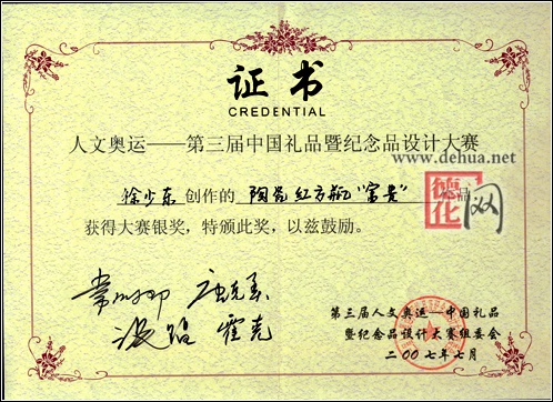 日前,人文奧運(yùn)——第三屆中國(guó)禮品暨旅游紀(jì)念品設(shè)計(jì)大賽落下帷幕,來(lái)自中國(guó)瓷都——福建德化縣的富貴紅名瓷“富貴”方瓶獲大賽銀獎(jiǎng)。