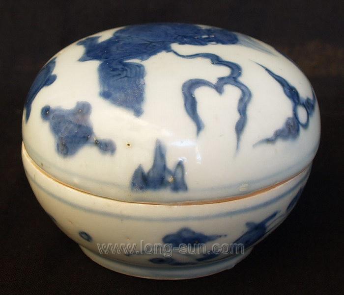 這是一個(gè)明代嘉靖時(shí)期的青花麒麟圖粉盒,盒蓋上畫的是一只麒麟,麒麟周圍繪火云和雜寶紋。麒麟與鳳、龍、龜并稱為"四靈",麒麟為"四靈"之首,是古代常見的瓷畫題材。元明時(shí)期麒麟通常畫作馬頭(也有畫作牛頭或虎頭)、鹿角、麟身、牛蹄、馬尾。這個(gè)粉盒紋飾吉祥、形制規(guī)整、畫工、青花發(fā)色、胎釉都具有典型的時(shí)代特征,是一件不錯(cuò)的把玩收藏品。瓷器釉色為蛋清釉。