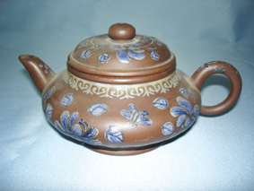 我們欣賞到此壺壺蓋邊緣的圈、沿口的圈和足圈,三圈圓潤自如,線條流暢,更顯出制壺藝人的功力。此壺紫砂本色為底,點(diǎn)彩白底青釉,雖然布滿壺身,但不失清新雅致之感。壺底一枚方印隸體陽文“邵享裕制”,這是一件迎合定制者的作品。