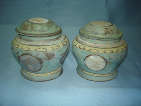 此蓋罐為“明器”,作為民間喪葬陪葬之用,紫砂為胎,外敷彩釉。通高10厘米,制作傳統(tǒng)講究,蓋鼓略高,短頸,罐身上部外鼓,下部略收,至底腳處外撇,十分等稱。彩釉以綠釉為底色,披肩處飾以黃色如意云紋,蓋頂部以圓白色為底,用紅色寫一“福”字,罐身亦是圓白色紅字寫“五谷七倉”四字,使用繁體書法端正裝飾在罐身四周以祈豐收平安。     從彩釉圖案風(fēng)格來看,為清中晚期之器。我于上世紀(jì)六十年代在宜興購得,因見其器型完整,又是一對,是屬于難得的紫砂古物,心甚雅愛。此器不足之處,由于南方潮濕而使此器彩釉有些剝落,字跡圖案也模糊不清,但也增添了一些古樸之美。
