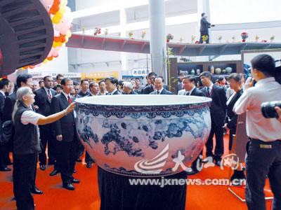 由景德鎮(zhèn)龍鳳陶瓷文化發(fā)展公司出品的“盛世名花”青花陶瓷大缸,10月18日正式在瓷博會開幕式上亮相。該瓷缸直徑1.66米,高0.8米,由景德鎮(zhèn)陶瓷技師余鵬飛手工拉坯、河北著名畫家、“中國牡丹王”崔廷玉繪畫,堪稱當(dāng)今世界之最。