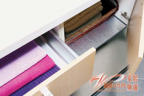 根據(jù)自己的平時(shí)沐浴經(jīng)驗(yàn),我們會(huì)發(fā)現(xiàn)浴室內(nèi)面盆或水龍頭遇到熱氣會(huì)產(chǎn)生大量的冷凝水,這些水會(huì)順著臺(tái)面流入柜子底部,引起柜體發(fā)霉變形。如果能及時(shí)在柜體底部加上一層防水鋁箔或是橡膠墊就能解決這個(gè)難題,把它們墊在抽屜底部,在防潮的同時(shí)還能固定浴品。