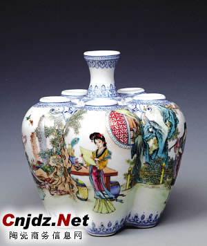 六管瓶,顧名思義有六個管,像是五個瓶罐包圍著中間高出一截的罐。陳靜告訴記者,這是粉彩“紅樓四美”六管瓶,是趙惠民的作品,瓶身上畫著黛玉、寶釵、寶玉等人,色彩很柔和,而且人物栩栩如生。市面上五管瓶是有的,這種“六管瓶”如今不多見。它的制作很煩瑣,管與管之間的縫隙和痕跡要不能顯露出來,確實需要精湛的工藝。陳靜表示,這六管瓶也是可以用來插花的,每管中分插幾枝,而且它管與管之間是串聯(lián)的,“不過這么精美的工藝品,一般還是以觀賞為主。”