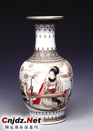 在人物或樹木上用金線勾勒,紋飾繁復,色階豐富,色調(diào)溫潤,頗有官窯氣派,這是任義平創(chuàng)作的“蔡文姬”瓶。蔡文姬在伏案寫字,畫面內(nèi)容頗多,藝人用金粉附著到瓷器上,再經(jīng)燒制。這里面有個關鍵,即金粉可能會與瓷器發(fā)生化學反應,致使效果喪失。據(jù)悉,這種“墨彩描金”的工藝在清乾隆之后失傳了,后來的藝人根據(jù)碎瓷片又慢慢摸索出來,如今只有個別大師會此工藝。