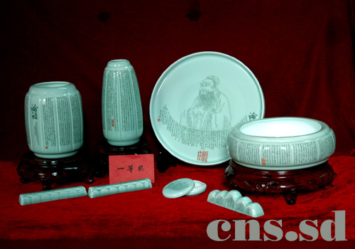中新山東網(wǎng)濟(jì)南11月11日電(通訊員 閆盛霆)山東省工藝美術(shù)大師、陶瓷藝術(shù)大師、淄博昆侖瓷器藝術(shù)瓷公司經(jīng)理李秋峰,歷時(shí)半年時(shí)間創(chuàng)作了8頭微雕刻瓷文具《論語(yǔ)》。微雕刻瓷文具將洋洋萬(wàn)言微刻在直徑200mm、高280mm的魯青瓷文具筆筒上,遠(yuǎn)看一字沒有,近看字字清晰,顯示出較高的刻瓷藝術(shù)水平和較高的書法技藝,具有較高的藝術(shù)價(jià)值、收藏價(jià)值。該作品在近日舉行的“2007年山東陶瓷藝術(shù)創(chuàng)新評(píng)比暨第二屆山東省陶瓷藝術(shù)創(chuàng)新評(píng)比”獲一等獎(jiǎng)。