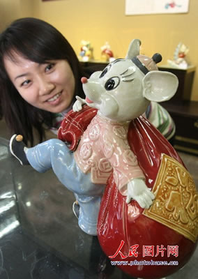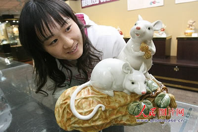 11月9日,一位女孩在觀賞一款造型可愛(ài)的陶藝鼠。