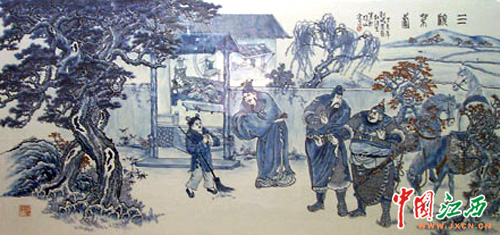 杜浩生介紹說,大瓷板燒制難,構(gòu)思繪制更不易。畫釉下青花工筆人物畫不僅要功力,對耄耋老人更需要體力和毅力;之所以選擇《三顧茅廬》這個歷史經(jīng)典題材,是因為人才問題不僅是歷史,更是社會現(xiàn)實問題,是構(gòu)建和諧社會,建設創(chuàng)新社會都迫切需要各種各樣的人才。
