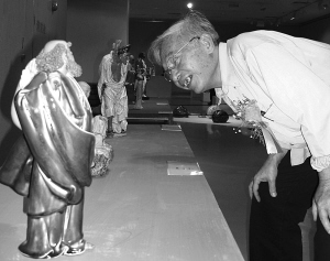 一位嘉賓正在仔細端詳陶藝作品。“達摩的胡子雕得那么逼真,是雕刻刀刻的呢,還是手捏的呢?”前日,在廣州美術(shù)學(xué)院大學(xué)城美術(shù)館、首屆廣東當(dāng)代陶藝大展開幕式現(xiàn)場,一位廣州市民看到中國工藝美術(shù)大師霍家榮的名作《達摩》后,不禁發(fā)出這樣的感嘆。