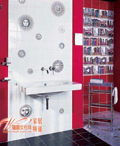 面盆所在的梳洗區(qū),早晨起床后、晚上就寢前的洗漱工作都在這里進(jìn)行,把這個(gè)區(qū)域的墻面設(shè)計(jì)得出眾些,用紅色和黑色瓷磚組拼一道主題裝飾墻,可讓一天的心情更加美好。