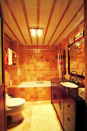 中式風(fēng)格一直延伸到衛(wèi)生間里,浴室柜上依然是古色古香的鎖扣和雕花的圖案,搭配鏡子的邊框和射燈,與現(xiàn)代的衛(wèi)浴設(shè)施很好地融為一體。內(nèi)嵌式的浴缸在增加空間層次的同時(shí)也縮短了空間的狹長(zhǎng)感。設(shè)計(jì)師采用了花色的瓷磚,在燈光下?tīng)I(yíng)造出溫暖輕松的環(huán)境。