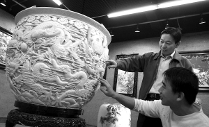 市民在展覽館內參觀陶瓷作品《浮雕龍缸》。昨日,記者在良致尚美術館看到,500多件顏色各異、造型精致的景德鎮(zhèn)瓷器吸引了大批愛好者入館欣賞。此次展出包括了曾獲中國中青年陶藝家收藏精品大賽金獎的作品《浮雕龍缸》等一批名家力作。