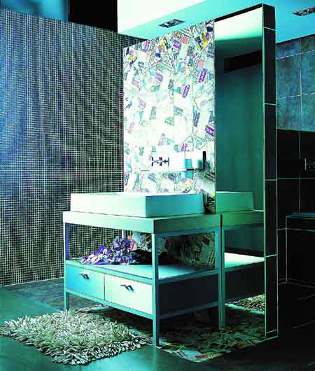 如果你的墻面底色較深就運用博洛尼最大膽的POP花色瓷磚作為主題墻裝飾墻面吧。讓報紙堆砌出的亮麗色彩大面積裝飾,拼貼的效果會使浴室設(shè)計看起來更加大氣,配上熠熠生輝拉絲鋁浴室家具和亮面鏡子絕對拉風(fēng)。張揚的創(chuàng)意是時尚年輕人不二的選擇。