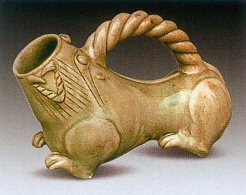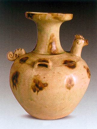 甌窯青瓷不但以釉色取勝,而且在造型上也有別于其他窯口,如鎮(zhèn)江市跑馬山東晉墓出土的青釉褐斑雞首壺,為淺盤口,雞首高昂,壺?zé)o把手,在雞首的對應(yīng)處,堆貼蠕體卷曲的尾飾。東晉時期墓葬出土的雞首壺一般都有把手,而此件卻別出心裁地堆貼出輕巧優(yōu)美的尾飾,從呆板的形態(tài)總"跳"了出來增添了活力和動感(圖1)。東晉時期青瓷盤口壺肩部一般設(shè)有雙系、四系、六系等,而鎮(zhèn)江市陽彭山磚瓦廠出土的一件東晉青釉八系盤口壺,肩部設(shè)有6個橋形系,在盤口沿內(nèi)又設(shè)雙系,使穿繩懸提時更加穩(wěn)當(dāng),融實用和美學(xué)于一體,更顯示出器形的曲線美(圖2)。六朝墓葬中出土的青瓷虎子較多,器形大同小異。而鎮(zhèn)江博物館藏南朝時期的青釉虎子,造型奇特,虎子前身大而聳峙,腰部收小,前后腿部微鼓,四爪翹起,顯得矯健有力;在頭的側(cè)面貼塑刻劃出牙齒、眼睛,使得抽象與寫實相結(jié)合,這不能說是一種創(chuàng)新(圖3)。大港南朝墓出土的青釉四系蓋罐,其蓋鈕打破了環(huán)形、橋形鈕的慣例,而做成方形,并在四邊中間設(shè)有凹槽,這種設(shè)計,是為了使繩索通過凹槽穿過罐身的系扎牢而不晃動,構(gòu)思巧妙(圖4)。上述甌窯青瓷獨特的造型,表現(xiàn)出甌窯工匠豐富的想象力和精湛的造型技巧。