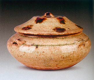 甌窯在東晉、南朝時期流行的褐斑裝飾變化莫測,有的在器物的口沿飾一圈褐彩,褐彩斑點較大,分布密集,色彩有濃有淡;有的在較大的器物口沿分三至四組點飾褐彩,每組點飾六點褐彩;有的在器物腹部或蓋面點飾圓珠狀褐彩或斑塊,相間交錯。鎮(zhèn)江市郊象山東晉墓出土的一件青釉四系褐斑蓋罐,以蓋鈕為起點,均稱地分布五條褐彩線,褐斑釉色由深入淺(圖5)。