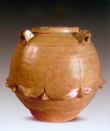 南朝時期,隨著佛教的盛行,作為佛教的象征物蓮花已成為瓷器上常采用的裝飾題材。鎮(zhèn)江博物館藏南朝青釉蓮花罐,在罐腹下部刻劃出一層覆蓮瓣,蓮瓣邊緣凸起,蓮瓣尖端略微上卷,成浮雕狀(圖6)。甌窯褐彩裝飾應(yīng)為釉下彩繪,釉下彩繪是指在胎體上彩繪后施釉,經(jīng)高溫一次燒成。從鎮(zhèn)江出土的甌窯青瓷褐彩中可以看出,褐彩緊貼于胎,青釉罩在褐彩上面。釉下彩繪的出現(xiàn),為唐代長沙窯釉下彩繪的發(fā)展開辟了道路。
