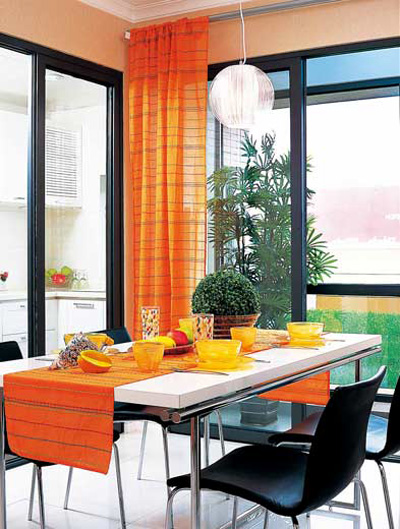 將原有的綠色窗簾和餐墊,替換成大面積溫暖豐富的橙色,打破了沉悶。 以“橙”為主題的餐具,同樣換下原有的餐盤,一改清冷,為餐桌增分。
