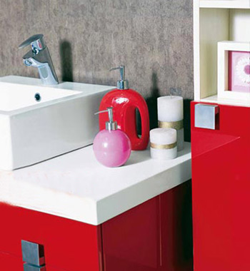 配有紅顏色浴室家具的衛(wèi)浴間,梳洗臺上可選購幾件紅色系的盥洗用品,擺在臺面上很好看,而且還能和家具的顏色形成呼應(yīng)
