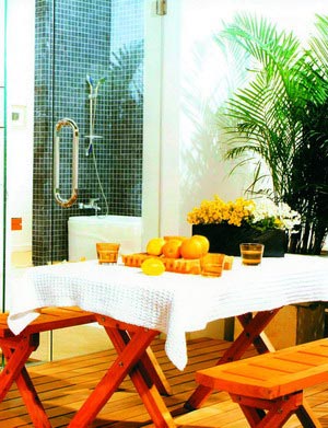 這個(gè)空間關(guān)鍵的地方不在裝修,而是浴室本身是否具備這樣條件的空間:它必須是朝南的,而且前面比較空曠,保證一年四季有大量陽光可以進(jìn)入室內(nèi)。