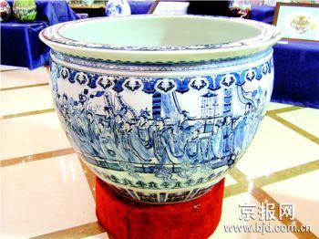 該作是好運北京景德鎮(zhèn)名品陶瓷展最耀眼的作品。它直徑約110厘米,高約81厘米,采用景德鎮(zhèn)傳統(tǒng)青花裝飾技法,是目前景德鎮(zhèn)制作的最為完整的大型瓷龍缸。陶瓷迷在一旁邊指點迷津說,龍缸制作難度大,燒制成功率低,一件好的龍缸作品千百年來一直是難得的藝術珍品!栋耸呱裣蓤D卷》青花大龍缸背后還藏著不少故事。2003年,25集電視連續(xù)劇《青花》攝制組到景德鎮(zhèn)選場景,并同時選一件青花大龍缸作為主要道具。各路陶瓷高手紛紛摩拳擦掌,有的廠家還投入巨資經(jīng)過數(shù)十次試制。在近百件龍缸中,行家最后相中了這件作品。