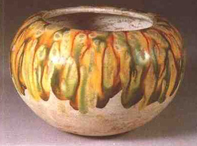 x 簡稱唐三彩,唐代(618~907年)生產(chǎn)的用高嶺土作胎,施黃、綠、藍、褐等多種色釉燒制而成的低溫釉陶器物。唐三彩是利用礦物質(zhì)中的金屬氧化物的呈色機理燒制而成的,以氧化鉛為助熔劑,在釉科中適量加入銅、鐵、鈷、錳等物質(zhì)作著色劑,在900℃溫度中銅的氧化物呈現(xiàn)綠色,鐵的氧化物呈黃或黃褐色,鈷的氧化物呈現(xiàn)藍色,錳的氧化物呈現(xiàn)紫黑色。在這些釉色的基礎(chǔ)上又成功地?zé)瞥龀赛S、深綠、赭色、茄紫等色彩,反映出唐代多彩陶器是在單彩陶器的基礎(chǔ)上發(fā)展而來的。唐三彩始燒于唐高宗時期,玄宗開元、天寶年間是三彩器發(fā)展的頂峰時期,這時三彩種類繁多。造型生動優(yōu)美,釉色絢麗多彩、在長安、洛陽的唐墓中出土最多,江蘇揚州、山西、河南、甘肅也有出土。天寶之后三彩器逐漸減少,唐晚期三彩器幾乎被瓷器所取代。唐三彩的制作工序如下;一、選料,三彩器很注重造型和釉色,因此對胎料選擇不精,胎質(zhì)中含有石英顆粒等雜質(zhì)。二、成型,用模制或輪制及捏塑粘接的方法成型、為掩蓋胎質(zhì)精糙,突出釉色,往往成型后再罩化妝土。三、素?zé),將陰干的坯胎?000℃左右的溫度燒堅。四、掛釉,按事前所設(shè)計的圖案調(diào)配釉料上釉。五、低溫?zé),各色釉藥?00℃溫度燒造過程中,釉汁熔融流動相互浸潤形成斑斕的色彩。六、開相,在不著釉的陶俑頭部以朱涂唇、以墨畫出眉毛、眼睛、頭發(fā),增強陶俑形態(tài)的神韻。唐代盛行厚葬,大小唐墓中出土三彩器甚多,反映出唐代社會生活的方方面面。根據(jù)已發(fā)表考古資料分析,唐三彩的器物類別,如生活用品,主要有瓶、壺、罐、缽、杯、盤、盂、燭臺、硯、枕等;模型,有亭臺樓榭、仿木箱柜、住房、倉庫、廁所、牛、馬車等;俑,有各種人物與動物,如貴婦、達官、男女侍、武士、天王、胡人及馬、駱駝、豬、羊、雞、狗等。唐代陶塑藝術(shù)成功之作也多表現(xiàn)于三彩作品中。如西安郊區(qū)鮮于庭誨墓出土的三彩駱駝載樂舞俑,是唐三彩中的佼佼者,造型獨特,釉色絢麗,人物形態(tài)逼真,是難得的稀世珍寶。公元8世紀,唐三彩作為—種商品與越窯青瓷、邢窯白瓷一并通過海上絲綢之路運往亞非各國,在印度尼西亞、朝鮮、日本、埃及等國家都出土有唐三彩。9~10世紀朝鮮、日本、埃及等國也在唐三彩的啟發(fā)下成功地?zé)隽司哂斜緡厣木赖蜏夭视蕴掌魅缧铝_三彩、奈良三彩等。(見下圖)