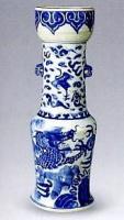 順冶時(shí)紋飾一般很粗獷,滿繪器物。有幾種紋飾是順冶時(shí)所獨(dú)有的,如常見(jiàn)于爐、罐上的非常粗獷的云龍,龍粗大威武,只露出頭、身、尾等幾截,其余部分被斑片狀云遮擋,好似兇猛的惡龍從濃黑滾滾的云中騰躍而出,其身忽隱忽現(xiàn)。這時(shí)也會(huì)有崇禎朝式的勾勒輪廓,涂青花留白形成的"括號(hào)"云,常見(jiàn)于花觚、罐之上的芭蕉瑞獸,獨(dú)角獸等;繪于盤(pán)、碗之上的人物故事,人物多居干庭院或室內(nèi),有一定的情節(jié)。這幾種紋飾一般都畫(huà)得很滿,很粗獷,青花沒(méi)有層次。除這些本朝特有紋飾以外,常見(jiàn)紋飾還有玉蘭怪石、纏枝牡丹、雉雞牡丹、四季花、山茶花、童子騎麒麟、八仙、布袋和尚、云鶴、博古等。