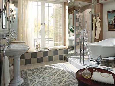 典型的鄉(xiāng)村休閑的衛(wèi)浴空間。仿古磨邊表面的墻磚、遍野薰衣草的泥土色澤,都呈現(xiàn)自然粗糙的紋理和顏色,自然但絕不簡(jiǎn)陋。