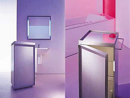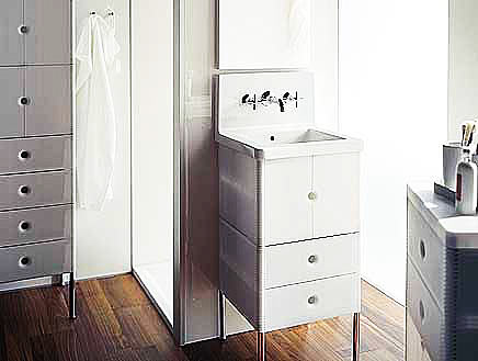 衛(wèi)生間是個特別容易凌亂的地方,沐浴用品比較多,因此浴柜的歸納整理功能必不可少。掛在墻上的柜體比較節(jié)約空間,從浴室柜誕生那一刻起就被人們廣為利用。然而,浴室也是個需要創(chuàng)新的地方,需要一些小驚喜帶來功能上的飛躍,杜拉維特一款倒椎體臺盆柜靈感來自一體柱形臺盆,但令人意想不到的是其下半部分用實木柜身替代,形態(tài)上仍然是柱形盆,而下部卻成了一個非常實用的儲物空間。