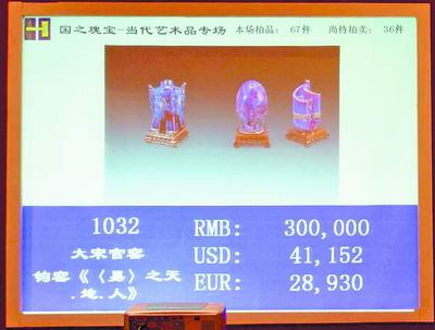 人民網(wǎng)河南視窗訊 大河網(wǎng)—大河報報道:昨日上午,在北京嘉里中心酒店二樓舉辦的翰海2007秋季拍賣會上,短短的40秒內(nèi),兩位神秘買家輪番競價,隨著拍賣槌“當(dāng)”聲落定,拍賣師宣布我省參加拍賣的大宋官窯鈞瓷《〈易〉天·地·人》系列作品以35.3萬元成交,創(chuàng)下鈞瓷當(dāng)代工藝作品的最高拍賣價。