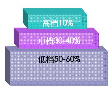 整個(gè)瓷磚市場(chǎng)高、中、低市場(chǎng)呈金字塔狀,高檔市場(chǎng)占整個(gè)市場(chǎng)的10%左右(附注:上海、廣州、北京可達(dá)到20%)。這個(gè)市場(chǎng)將隨著業(yè)主品位的不斷提升及可支配收入的增加而逐漸加大。