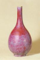 這種瓶又稱“錐把瓶”,造型與膽瓶相類,區(qū)別在于膽瓶的最寬處在下腹部,錐把瓶的最寬處在中腹部,重心位置不同。這種瓶子的足端有平切、平切后再外斜削一刀等兩種情況。釉面有亮晶點(diǎn),滿布小鑿坑。乾隆官窯中,像錐把瓶之類的窯變釉器,它的圈足內(nèi)部都罩醬釉,釉質(zhì)清亮,但深淺不一,施釉后再寫款銘;道光朝以后的窯變釉器,底部醬釉就比較平均,色澤一致。