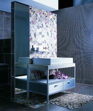 如果你的墻面底色較深就運(yùn)用博洛尼最大膽的POP花色瓷磚作為主題墻裝飾墻面吧。讓報紙堆砌出的亮麗色彩大面積裝飾,拼貼的效果會使浴室設(shè)計看起來更加大氣,配上熠熠生輝拉絲鋁浴室家具和亮面鏡子絕對拉風(fēng)。張揚(yáng)的創(chuàng)意是時尚年輕人不二的選擇。