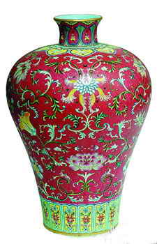 梅瓶誕生于北宋時(shí)期,因口徑之小僅能插梅枝而得名。本文介紹的這件清乾隆紫地軋道粉彩勾蓮紋梅瓶,以其典雅、秀美的造型,體態(tài)曲線,深受世人喜愛。該梅瓶形軀飽滿,豐艷的粉彩釉色及完美的手工讓此器成為存世乾隆官窯瓷器中最令收藏家夢(mèng)寐以求的珍品之一。這件清乾隆紫地軋道粉彩勾蓮紋梅瓶的制造過程十分繁復(fù),燒好瓶胎后,工匠繼而用一種狀如繡針的金屬工具在彩色釉地上撥畫出一種細(xì)如毫芒的鳳尾紋,俗稱“軋道”工藝,再以粉彩料加繪出勾蓮紋花卉圖案,被稱為“錦上添花”。