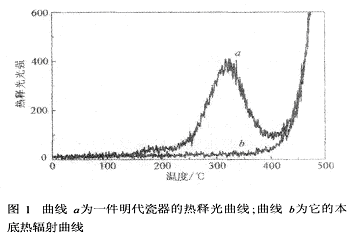 熱釋光的微觀機(jī)理是很復(fù)雜的,通常均使用離子晶體缺陷模型來進(jìn)行解釋.顯然這模型有一定的局限性,因?yàn)閷盘沾蔁後尮庑?yīng)作出主要貢獻(xiàn)的SiO2并不是單純的離子晶體.由于硅和氧的電子親和力不同,SiO2的4條Si—O鍵具有40%的離子性和60%的共價性.但離子晶體缺陷模型仍可以給熱釋光一個定性的微觀解釋 [3~6].客觀上離子晶體雖由正負(fù)離子晶格構(gòu)成,但它并不呈完全理想的周期排列,而是存在各種類型的缺陷.最普遍的有,雜質(zhì)原子的代位或填隙缺陷、局部位錯或畸變等.但對熱釋光作出貢獻(xiàn)的主要機(jī)理是,在核輻射的作用下,離子晶體的負(fù)離子離開正常的位置形成負(fù)離子空穴,使該位置成為電子的“陷阱”.當(dāng)被核輻射激發(fā)到導(dǎo)帶的電子擴(kuò)散到“陷阱”附近時就會被吸引成為“俘獲電子”.另一方面,核輻射電離形成的空穴也在價帶中擴(kuò)散,它可能被雜質(zhì)離子所“俘獲”,形成“釋光中心”“俘獲電子”處于導(dǎo)帶下的新能級,而空穴形成的“釋光中心”則處于價帶上的新能級,這兩者都是亞穩(wěn)態(tài).它們的數(shù)量顯然和樣品歷史上所經(jīng)受的核輻射數(shù)量成比例.熱釋光就是上述電離的復(fù)合過程.當(dāng)取出的樣品被加熱時,晶格原子的熱振動將變得劇烈,“俘獲電子”從中獲得離開“電子陷阱”的能量,重新在導(dǎo)帶中自由擴(kuò)散.當(dāng)它擴(kuò)散至空穴所在的“釋光中心”與空穴離子復(fù)合時就發(fā)出所謂的“熱釋光”。.顯然,熱釋光的色及強(qiáng)度與陷阱能級深度及數(shù)量有關(guān),如在樣品加熱升溫的過程中連續(xù)地測量熱釋光的光強(qiáng),就可得出一條溫度一光強(qiáng)的熱釋光曲線.它是樣品年齡計算的基本數(shù)據(jù).圖1中曲線a給出的是對一件明代瓷器實(shí)測的熱釋光曲線,它的熱釋光峰出現(xiàn)在300℃附近;曲線b是本底熱輻射曲線.