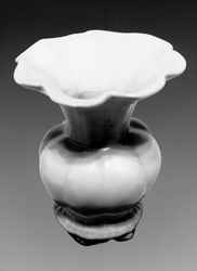 這是一件南宋湖田窯的花瓶,它高15厘米,口寬約9厘米?纹靠谌绶剖嬲梗款i與瓜楞形瓶肚接得妥帖,恰如其分,整個瓶體大氣,花瓶的釉面雖更顯牙白,但像涂了一層油脂似的滋潤,放在手中摩挲把玩,有一種手執(zhí)美玉賞心悅目之感。