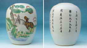 圖真合刷花《三陽開泰圖》冬瓜罐,高27厘米,最大圍70厘米,口徑14厘米,底徑20厘米。斂口,圓鼓腹,白胎,胎質(zhì)細(xì)膩堅(jiān)硬,通體施白釉。此圖以山間小溪旁邊三只羊?yàn)橹黝},白羊靜靜的吃草,黑羊凝望前方,棕色的羊抬頭看著天空,以松樹、太陽作背景。巧妙地利用不同大小、不同顏色的色塊,將三只羊表現(xiàn)得神態(tài)各異。