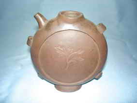 此壺為清早期之器,原型應(yīng)是早年北方草原游牧民族跨在身上隨時飲用之器,而后又為軍旅攜帶用品。故此器中使人感覺到有一種慓悍騎兵之氣息。