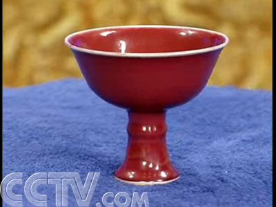 毛曉滬:現(xiàn)在呢就是目前呢,我根據(jù)我們傳統(tǒng)鑒定經(jīng)驗(yàn)看,從那個(gè)胎質(zhì)釉質(zhì)。包括青花的款識(shí)還有它的造型,以及它的紅的顏色上,可以說呢,沒有看出明顯的造假的破綻。那么呢最好呢還是用儀器再做進(jìn)一步的檢測(cè)。如果各方面都沒有問題的話,那么這是一只非常,就是一只,非常名貴的明代宣德的寶石紅釉高足杯。