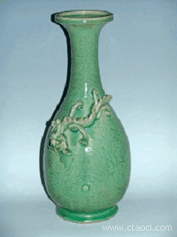 醬釉洗口蟠龍瓶,高23厘米,口徑6.9厘米,胎呈灰褐色。平底淺圈足,向上漸開(kāi),腹壁相對(duì)平直,平肩長(zhǎng)頸,盤口直而薄。接腹處器外側(cè)手捏一圈絲帶飄忽狀泥條裝飾,既加固接縫,防止燒裂,又顯輕盈素雅。頸部蟠龍奮趾張目,悍武有力。飄帶裝飾有如祥云涌動(dòng),蛟龍大有騰云而去之勢(shì)……