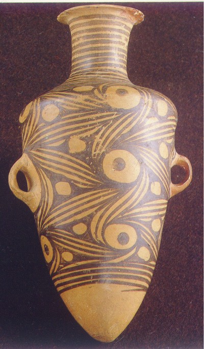 旋紋實底瓶。馬家窯類型尖底瓶為當時人們?nèi)∷畬iT設(shè)計的造型。這件尖底瓶的腹部上繪有四方連續(xù)的旋絲毫,象波動水面上的旋渦,和諧得體。