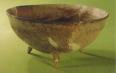 寬帶紋三足缽大地灣一期文化。大地灣文化亦稱老官臺文化,發(fā)現(xiàn)于甘肅省東部,距今八千年至七千年,是世界上最早出現(xiàn)的新陶文化。