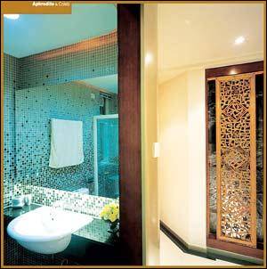一般的普通住宅浴室,可安裝取暖、照明、排氣三合一的"浴霸"、普通的浴缸、坐便器、臺(tái)式洗面盆、冷熱沖洗器、浴簾、毛巾架、浴鏡等。地面、墻面貼瓷磚,頂部可采用塑料板或有機(jī)玻璃吊頂。面積小的浴室,應(yīng)注意合理利用有限的空間,淋浴器比浴缸顯得經(jīng)濟(jì)與方便,臉盆可采用托架式,墻體空間可利用來(lái)做些小壁櫥、鏡面箱等,用來(lái)放置些零星物品。墻上門后可安裝掛鉤,用于掛衣帽之類物品。